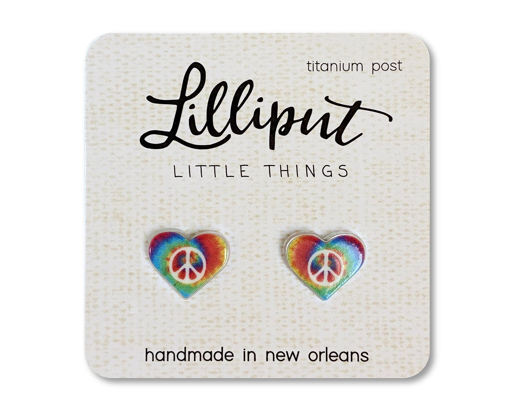 Boho/Hippie Style Earrings featuring a tie dye heart and white peace sign, reminiscent of an old festival t-shirt.